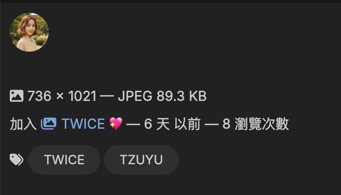 在圖片下方左側,會顯示圖片的 標題、所屬相簿,以及 上傳時間。